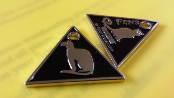 Triangle with cat on front and back with geo cache name on back